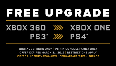 If you purchase a digital copy of Call of Duty: Advanced Warfare on Xbox 360 or PlayStation® 3 before March 31st, 2015, you will be able to download the next-gen version within the same console family for free.