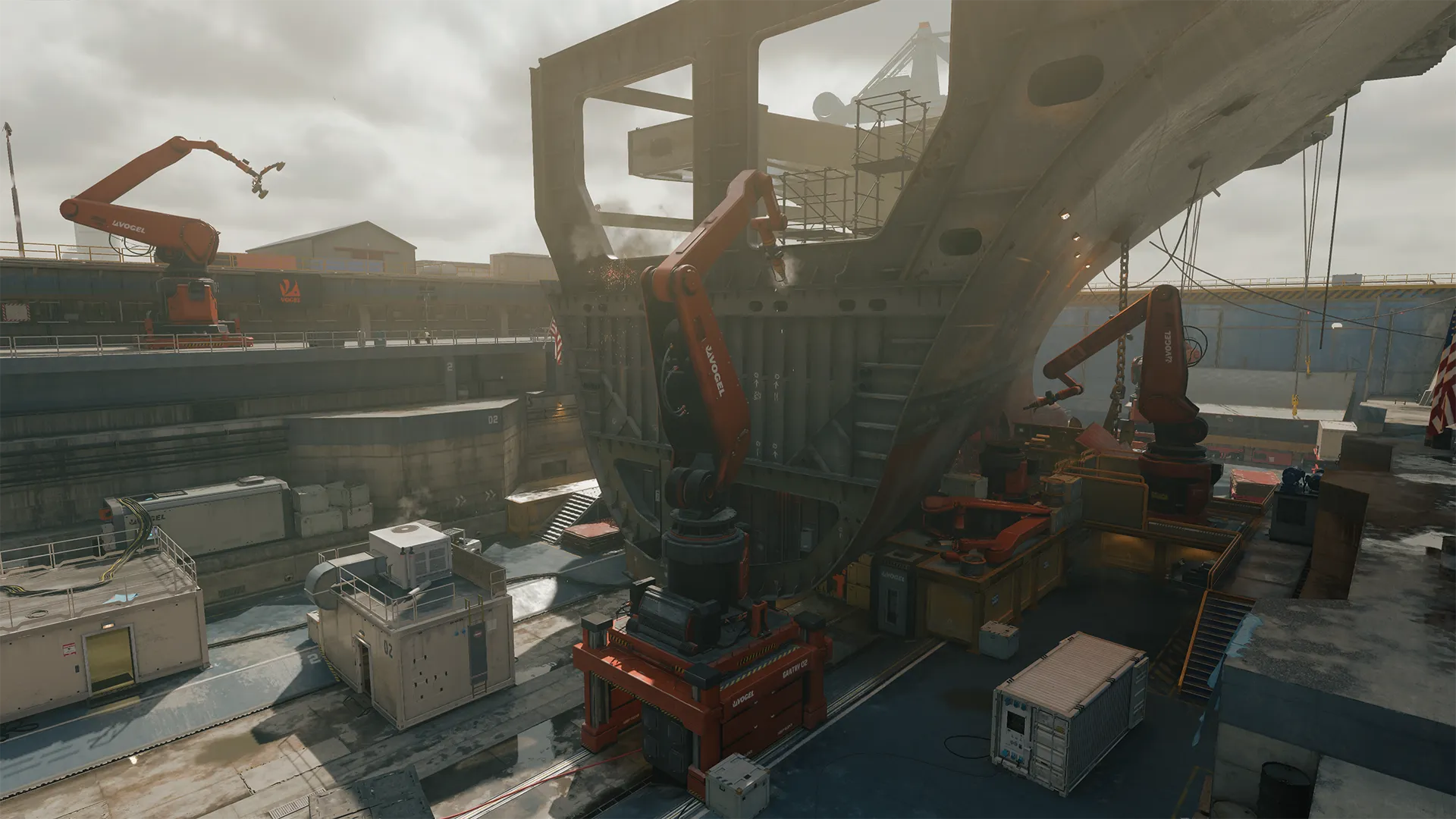 JSOC uncovers chilling clues about Menendez inside the decommissioned USS Barrack Obama, anchored off the coast of the USA. A small 6v6 map that also supports Gunfight and Face Off modes, Flagship takes place around and underneath the aircraft carrier once used by David Mason and his team as a base in Call of Duty®: Black Ops 2. Fight along the underside of the ship’s Bow or take to the sides near the welding arms and gantries at work on the carrier.