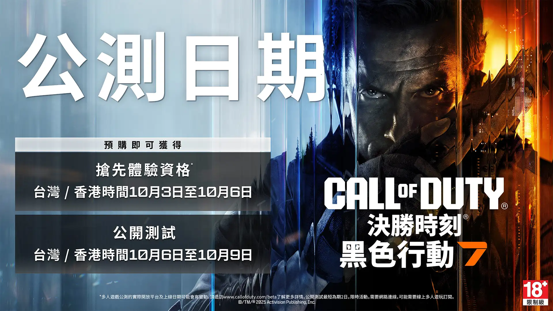 《決勝時刻:黑色行動7》公開測試*是你搶先體驗《決勝時刻:黑色行動7》並且提供寶貴意見的絕佳機會,你的寶貴意見將協助我們讓遊戲在11月14日上市時帶來頂級的遊戲體驗。